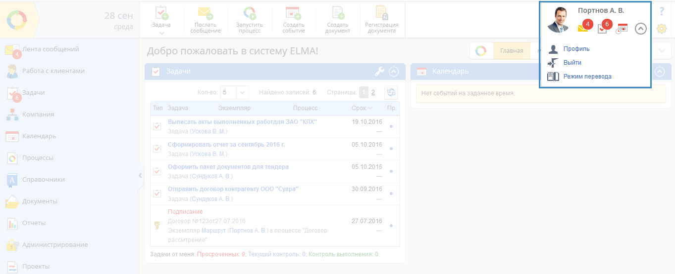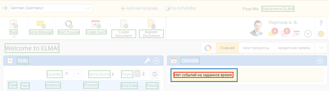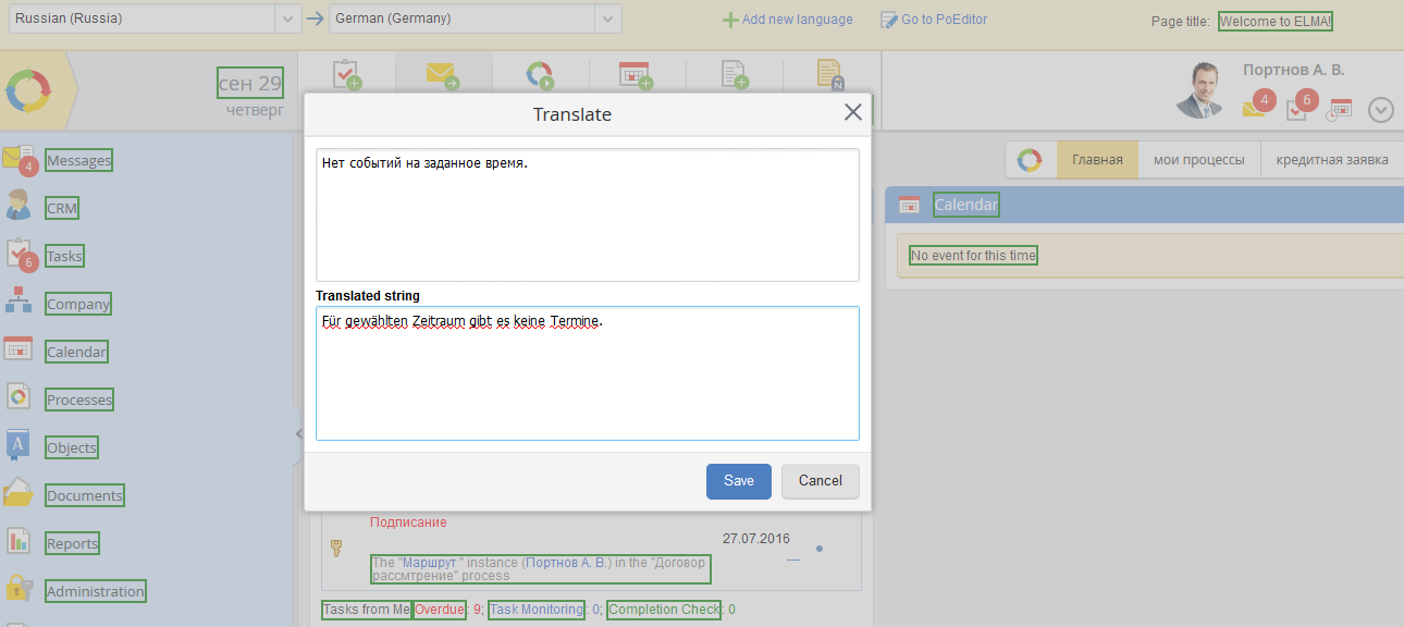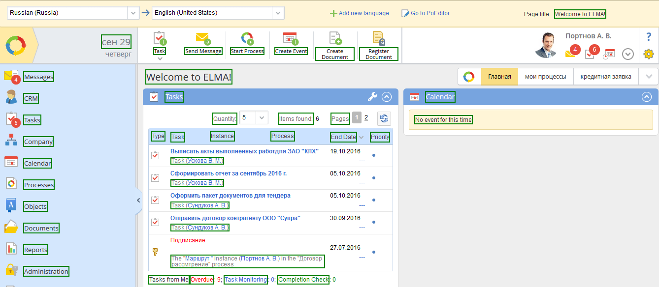 - через интерфейс – при этом переводятся все элементы страниц системы ELMA;