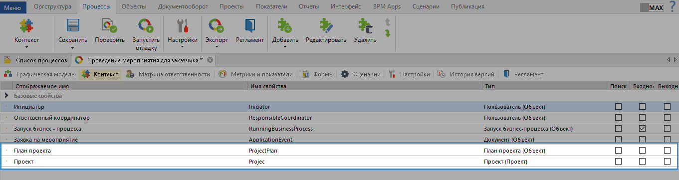 В системе ELMA доступны функции быстрого просмотра и редактирования плана проекта из задачи по процессу. Для того чтобы данные функции стали доступны, в Дизайнере ELMA на вкладке Контекст требуемого процесса необходимо создать переменные типа Проект (Проект) и План проекта (Объект) (рис.1).