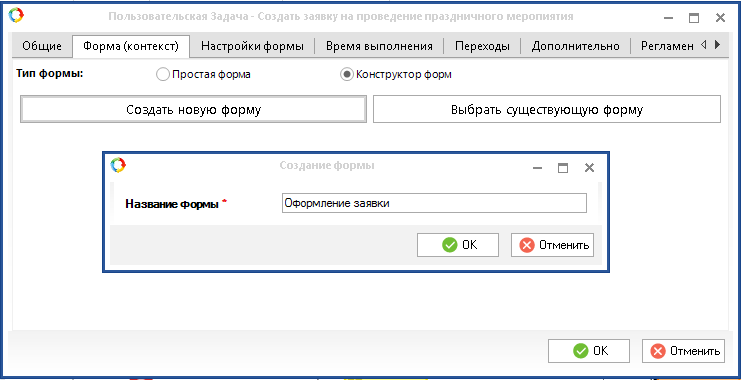 Рис.3. Дизайнер ELMA. Настройки пользовательской задачи. Вкладка "Форма (контекст)". Создание новой формы