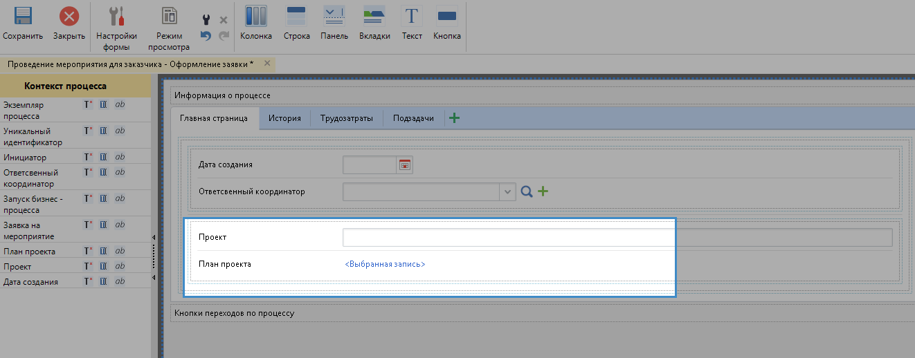 На форму задачи необходимо вынести контекстные переменные типа Проект (Проект) и План проекта (Объект), чтобы форма корректировки плана проекта стала доступной на форме пользовательской задачи в веб-приложении ELMA.