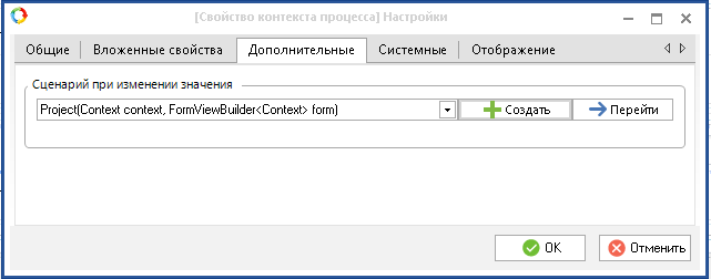 Затем необходимо открыть настройки элемента формы Проект с помощью двойного щелчка левой кнопкой мыши по элементу или с помощью вызова контекстного меню однократным нажатием правой кнопки мыши и выбора пункта Настройки. В открывшемся окне настроек перейти на вкладку Дополнительные и нажать на кнопку Указать сценарий (рис. 4).
