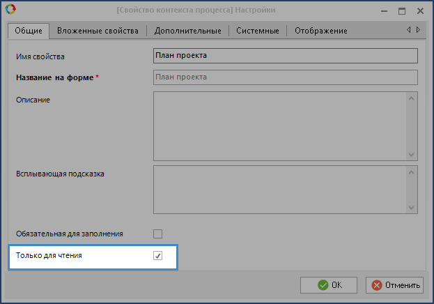Рис.7. Дизайнер ELMA. Настройки элемента формы "План проекта". Вкладка "Общие"