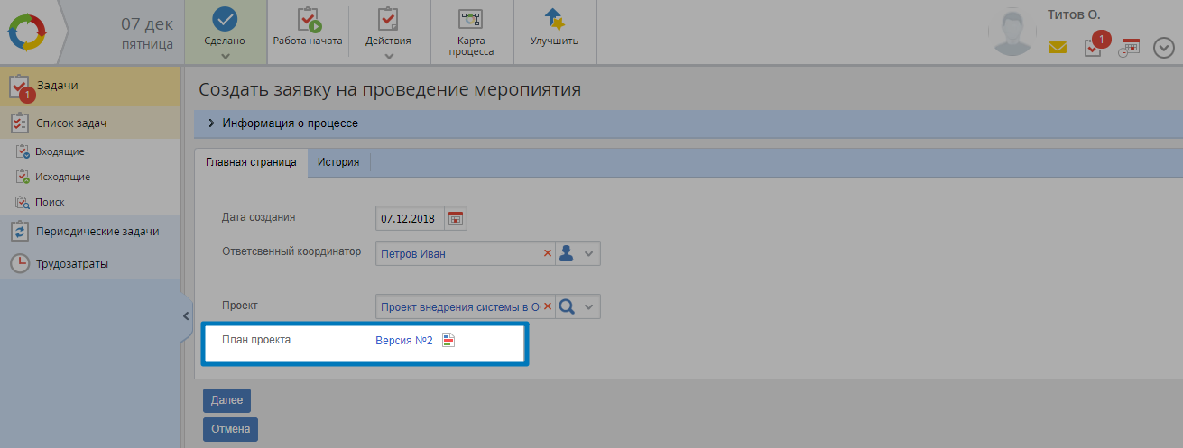 В том случае, если при настройке свойства флажок Только для чтения (рис. 7) не был установлен, то на форме задачи в веб-приложении рядом с названием версии плана появится кнопка