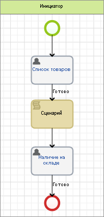 Ниже представлена карта процесса с блоком Сценарий, результатом которого станет установка значения свойства Наличие на складе равное "true":