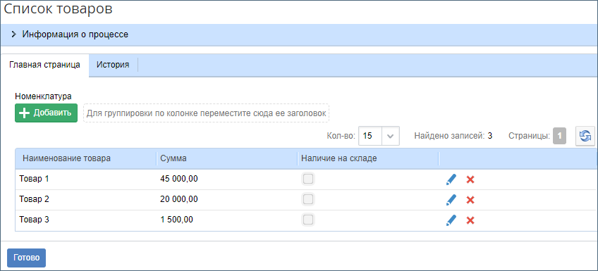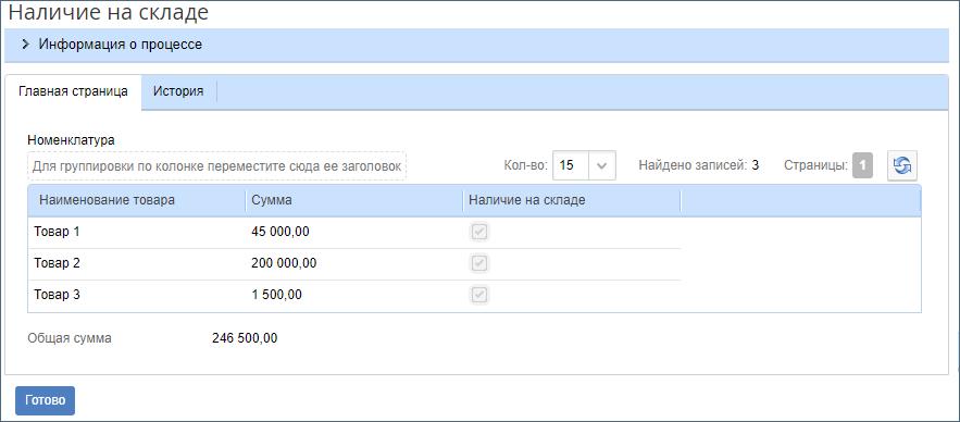 В первой задаче бизнес-процесса пользователь заполняет блок вручную, затем после выполнения задачи установлен блок Сценарий, который устанавливает всем элементам блока значение свойства Наличие на складе равное "true".