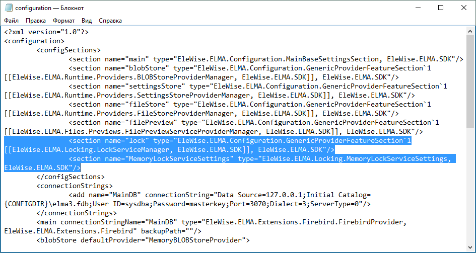 <section name="MemoryLockServiceSettings" type="EleWise.ELMA.Locking.MemoryLockServiceSettings, EleWise.ELMA.SDK"/>