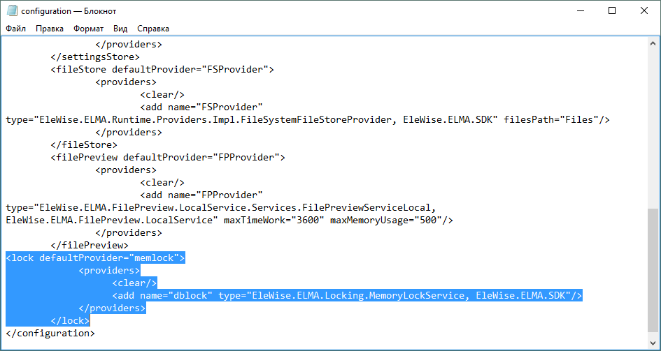 <add name="dblock" type="EleWise.ELMA.Locking.MemoryLockService, EleWise.ELMA.SDK"/>