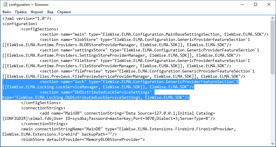 <section name="DbDistributedLockServiceSettings" type="EleWise.ELMA.Locking.DbDistributedLockServiceSettings, EleWise.ELMA.SDK"/>