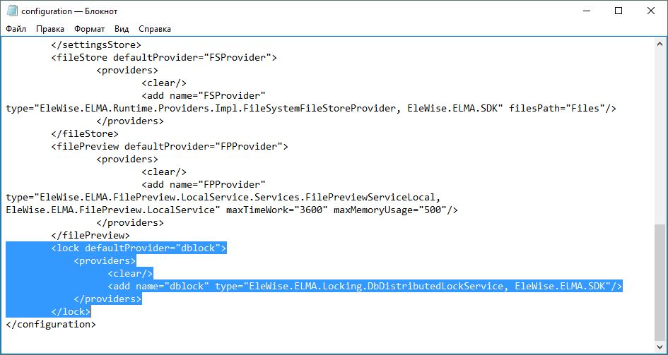 <add name="dblock" type="EleWise.ELMA.Locking.DbDistributedLockService, EleWise.ELMA.SDK"/>