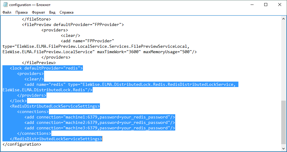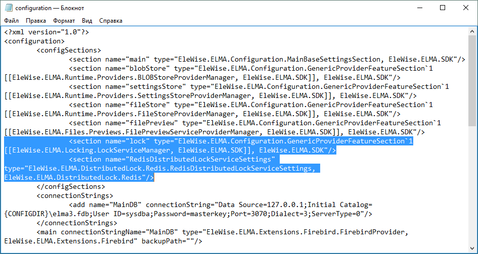 <section name="RedisDistributedLockServiceSettings" type="EleWise.ELMA.DistributedLock.Redis.RedisDistributedLockServiceSettings, EleWise.ELMA.DistributedLock.Redis"/>