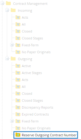 If the Contract Management application is activated, you can reserve registration numbers for outgoing contracts. To do so, click on the action-folderReserve Outgoing Contract Number in the Contract Management folder in the Documents section (fig. 2).