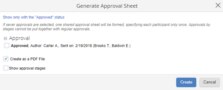You can generate an approval sheet on the document page. In case of Approval by Stages, the sheet generation window will feature an additional checkbox Show approval stages (fig. 4). If you check this box, the exported approval sheet will include all the approval stages (fig. 5).