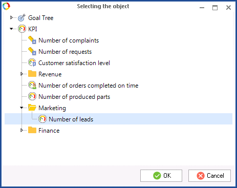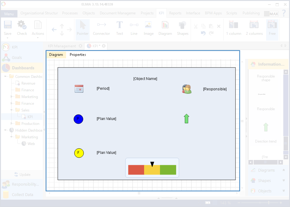 3. Information elements displaying the KPI value must be bound with the matching indicator. In our example these elements are: Object name, Period, Plan value, Fact value, Responsible, Trend direction, Trend value%, Scale.
