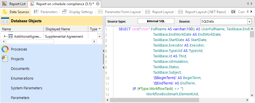In ELMA, you can create a report with several data sources. It allows displaying results of different requests in one report. You can use HQL and SQL requests in one report. All the data sources, available in one report are in the Source drop down field, at the top of the Data Sources tab.
