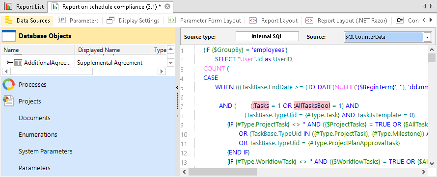 Report on Schedule Compliance is an example of a report with two data sources. This report displays detailed information on the tasks of a system user over a certain period: list of tasks, completed on time, overdue and so on.