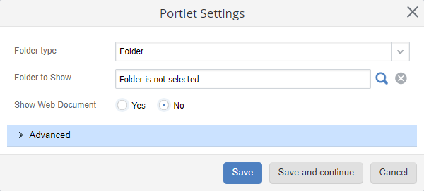 If you need to configure additional settings, click Advanced and fill in the required fields. To learn more, see Portlet Settings.