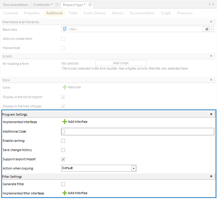 Implemented filter interfaces - the ability to add an implemented filter interface. In the dialog that opens, enter the full name of the interface type and click OK.