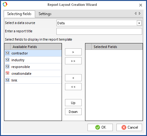 Fig. 1. "Report Layout Creation Wizard" dialog box. "Selecting fields" tab