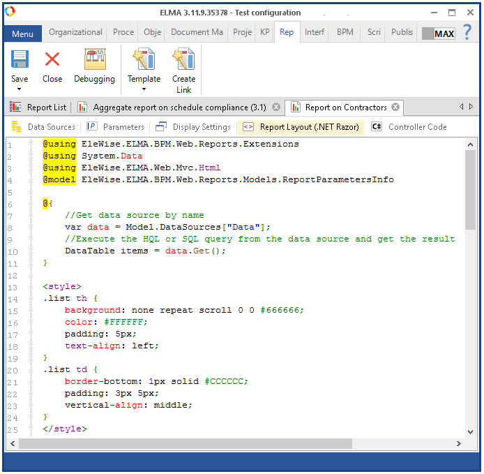 Fig. 3. "Report Layout (.NET Razor)" tab. Report code, created by the template wizard