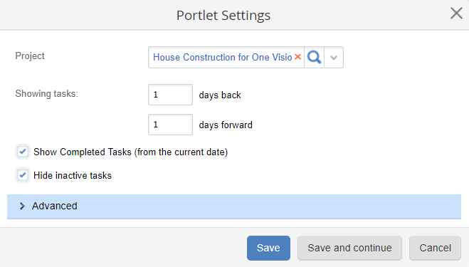 Custom settings of this portlet are similar to the settings of the Project Messagesportlet. To learn more, see the respective Help section. When setting up the Tasks from me portlet, you can select the required project and Hide inactive tasks. To select the project, click the list button or the icon (fig. 3). To learn more, click here.