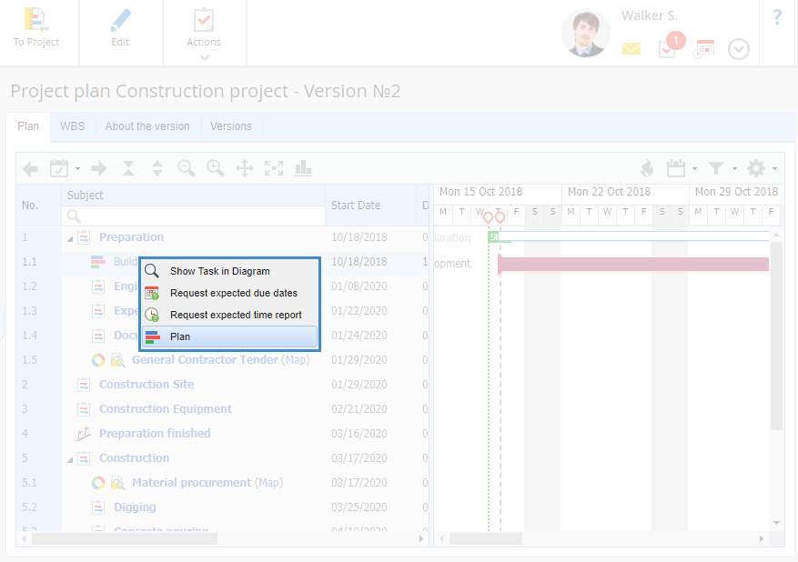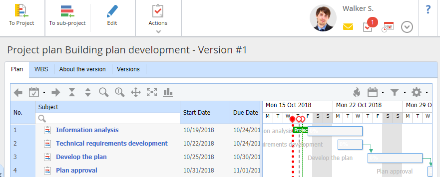 Fig. 1. Sub-project page. Actions - Go to Plan button