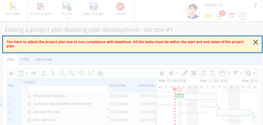 If the sub-project tasks go beyond the sub-project deadlines, a corresponding notification will be displayed (fig. 4).
